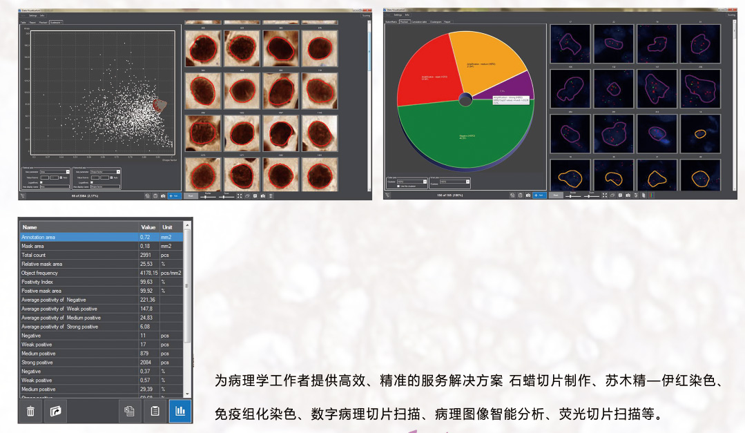 數字病理圖片分析基于全玻片掃描圖片,分析軟件HistoQuant適用于所有染色,基于光密度和色值的彩色圖像分割,并能深度自我學(xué)習,多次分析測算后,能快速主動(dòng)尋找標記陽(yáng)性區域。同時(shí)還有細胞核分析軟件NuclearQuant,適用于免疫組織化學(xué)(ER,PR和Ki67等核染色);細胞膜分析軟件MembraneQuant,適用于免疫組織化學(xué)(HER2, EGFR等膜染色);