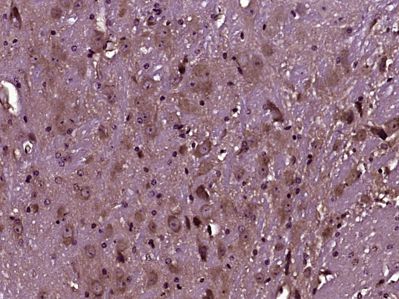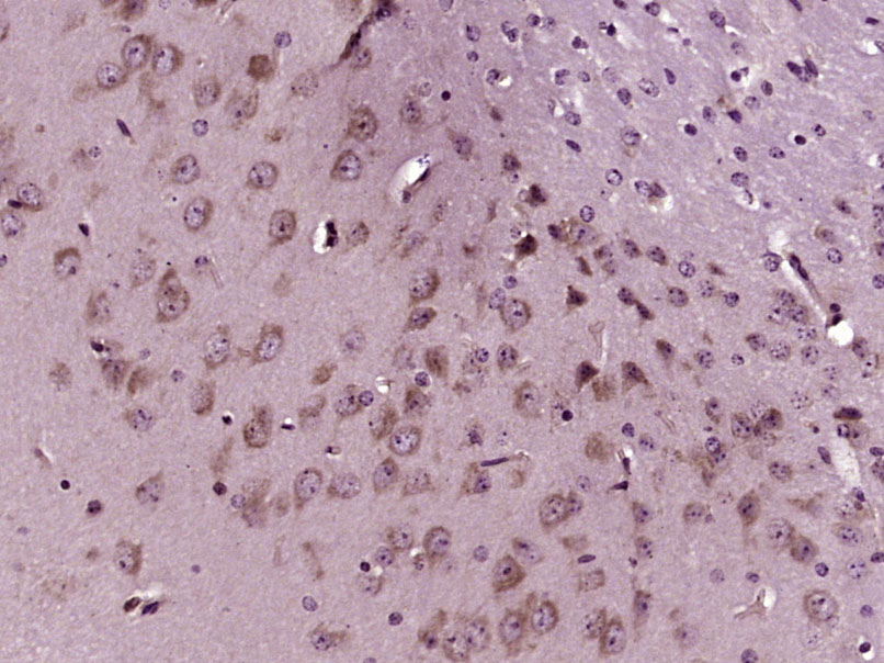 Paraformaldehyde-fixed, paraffin embedded (Mouse brain); Antigen retrieval by boiling in sodium citrate buffer (pH6.0) for 15min; Block endogenous peroxidase by 3% hydrogen peroxide for 20 minutes; Blocking buffer (normal goat serum) at 37°C for 30min; Antibody incubation with (CD147) Polyclonal Antibody, Unconjugated (bs-0684R) at 1:400 overnight at 4°C, followed by operating according to SP Kit(Rabbit) (sp-0023) instructionsand DAB staining.