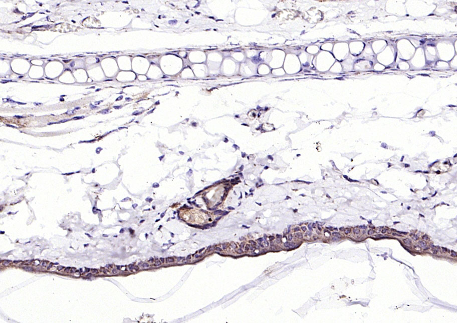 Paraformaldehyde-fixed, paraffin embedded (mouse skin); Antigen retrieval by boiling in sodium citrate buffer (pH6.0) for 15min; Block endogenous peroxidase by 3% hydrogen peroxide for 20 minutes; Blocking buffer (normal goat serum) at 37°C for 30min; Antibody incubation with (ECM1) Polyclonal Antibody, Unconjugated (bs-0776R) at 1:200 overnight at 4°C, followed by operating according to SP Kit(Rabbit) (sp-0023) instructionsand DAB staining.