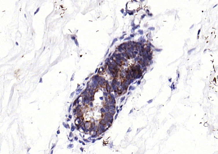 Paraformaldehyde-fixed, paraffin embedded (human breast carcinoma); Antigen retrieval by boiling in sodium citrate buffer (pH6.0) for 15min; Block endogenous peroxidase by 3% hydrogen peroxide for 20 minutes; Blocking buffer (normal goat serum) at 37°C for 30min; Antibody incubation with (ECM1) Polyclonal Antibody, Unconjugated (bs-0776R) at 1:200 overnight at 4°C, followed by operating according to SP Kit(Rabbit) (sp-0023) instructionsand DAB staining.