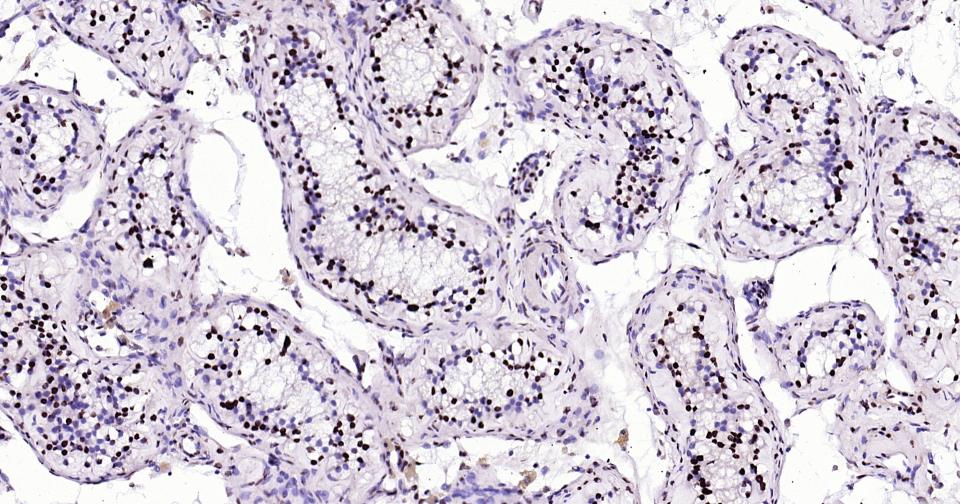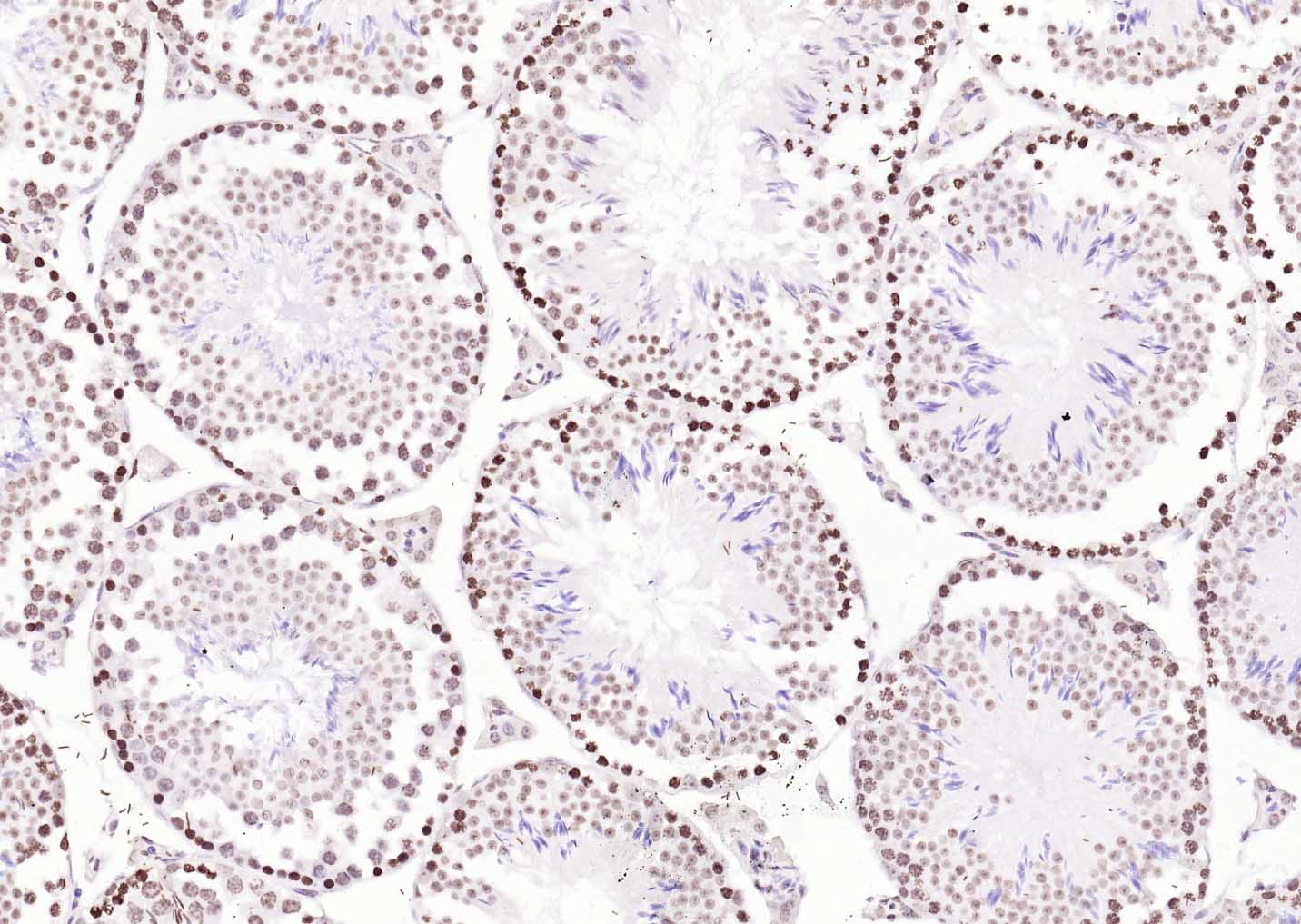 Paraformaldehyde-fixed, paraffin embedded Human Testicles; Antigen retrieval by boiling in sodium citrate buffer (pH6.0) for 15 min; Antibody incubation with Histone H3 Polyclonal Antibody, Unconjugated (bs-0349R) at 1:1000 overnight at 4°C, followed by conjugation to the bs-0295G-HRP and DAB (C-0010) staining.