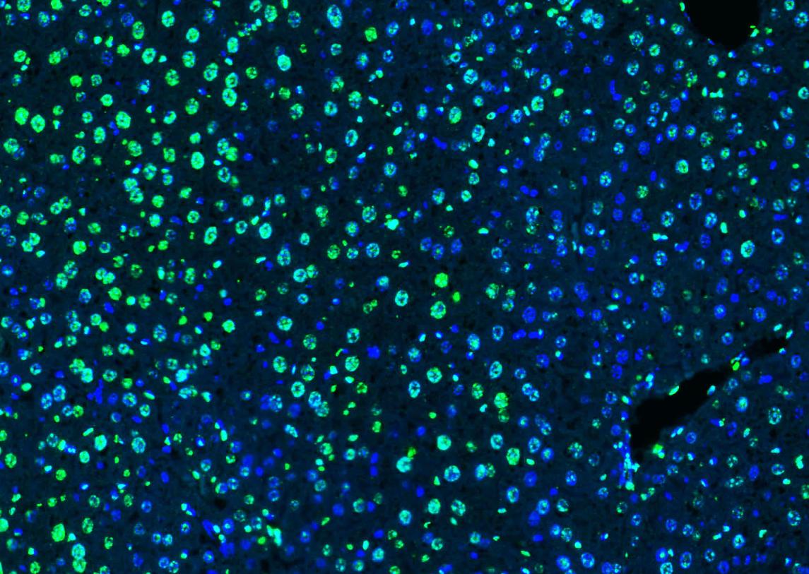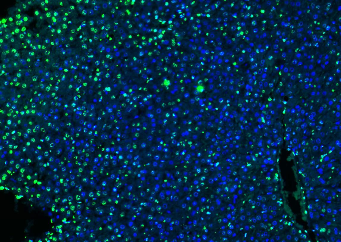 Paraformaldehyde-fixed, paraffin embedded (mouse liver); Antigen retrieval by boiling in sodium citrate buffer (pH6.0) for 15min; Blocking buffer (normal goat serum) at 37°C for 30min; Antibody incubation with (Histone H3 (Nuclear Loading Control)) Polyclonal Antibody, Unconjugated (bs-0349R) at 1:300 overnight at 4°C, followed by a conjugated Goat Anti-Rabbit IgG antibody (YF488) for 90 minutes, and DAPI for nuclei staining.