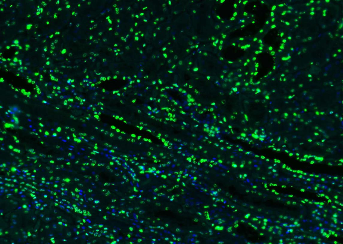 Paraformaldehyde-fixed, paraffin embedded (Human kidney); Antigen retrieval by boiling in sodium citrate buffer (pH6.0) for 15min; Blocking buffer (normal goat serum) at 37°C for 30min; Antibody incubation with (Histone H3 (Nuclear Loading Control)) Polyclonal Antibody, Unconjugated (bs-0349R) at 1:300 overnight at 4°C, followed by a conjugated Goat Anti-Rabbit IgG antibody (YF488) for 90 minutes, and DAPI for nuclei staining.