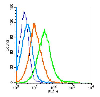 The cells were fixed with 2% paraformaldehyde (10 min). Primary antibody (bs-0349R, 1μg /1x10^6 cells) were incubated for 30 min on the ice, followed by 1 X PBS containing 0.5% BSA + 1 0% goat serum (15 min) to block non-specific protein-protein interactions. Then the Goat Anti-rabbit IgG/PE antibody was added into the blocking buffer mentioned above to react with the primary antibody at 1/200 dilution for 30 min on ice. Acquisition of 20,000 events was performed.