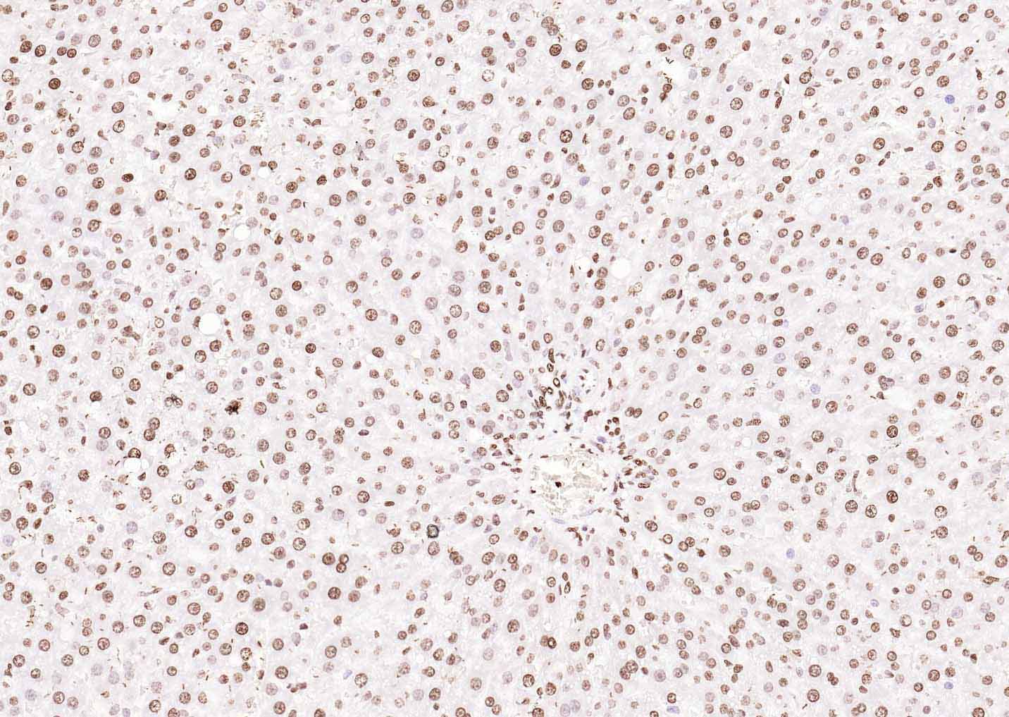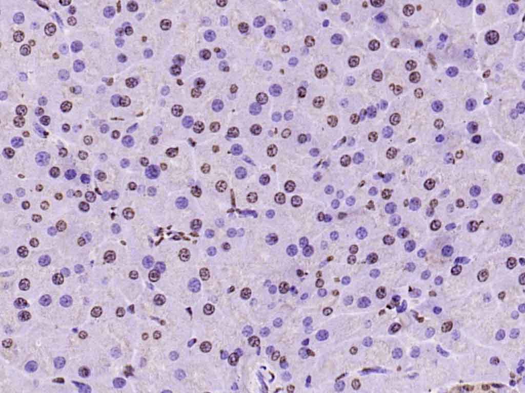 Paraformaldehyde-fixed, paraffin embedded (mouse liver); Antigen retrieval by boiling in sodium citrate buffer (pH6.0) for 15min; Block endogenous peroxidase by 3% hydrogen peroxide for 20 minutes; Blocking buffer (normal goat serum) at 37°C for 30min; Antibody incubation with (Histone H3 (Nuclear Loading Control) ) Polyclonal Antibody, Unconjugated (bs-0349R) at 1:200 overnight at 4°C, followed by operating according to SP Kit(Rabbit) (sp-0023) instructionsand DAB staining.