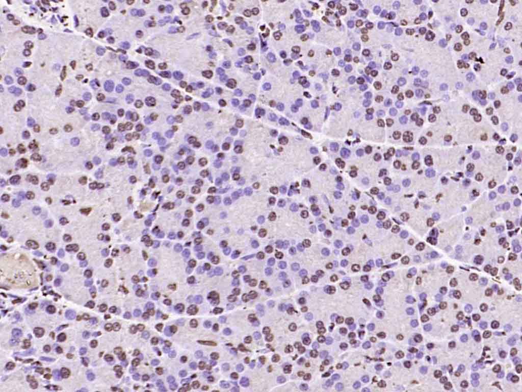 Paraformaldehyde-fixed, paraffin embedded (mouse pancreas); Antigen retrieval by boiling in sodium citrate buffer (pH6.0) for 15min; Block endogenous peroxidase by 3% hydrogen peroxide for 20 minutes; Blocking buffer (normal goat serum) at 37°C for 30min; Antibody incubation with (Histone H3(Nuclear Loading Control)) Polyclonal Antibody, Unconjugated (bs-0349R ) at 1:200 overnight at 4°C, followed by operating according to SP Kit(Rabbit) (sp-0023) instructionsand DAB staining.