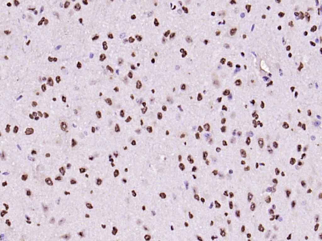 Paraformaldehyde-fixed, paraffin embedded (mouse brain); Antigen retrieval by boiling in sodium citrate buffer (pH6.0) for 15min; Block endogenous peroxidase by 3% hydrogen peroxide for 20 minutes; Blocking buffer (normal goat serum) at 37°C for 30min; Antibody incubation with (Histone H3(Nuclear Loading Control)) Polyclonal Antibody, Unconjugated (bs-0349R ) at 1:200 overnight at 4°C, followed by operating according to SP Kit(Rabbit) (sp-0023) instructionsand DAB staining.
