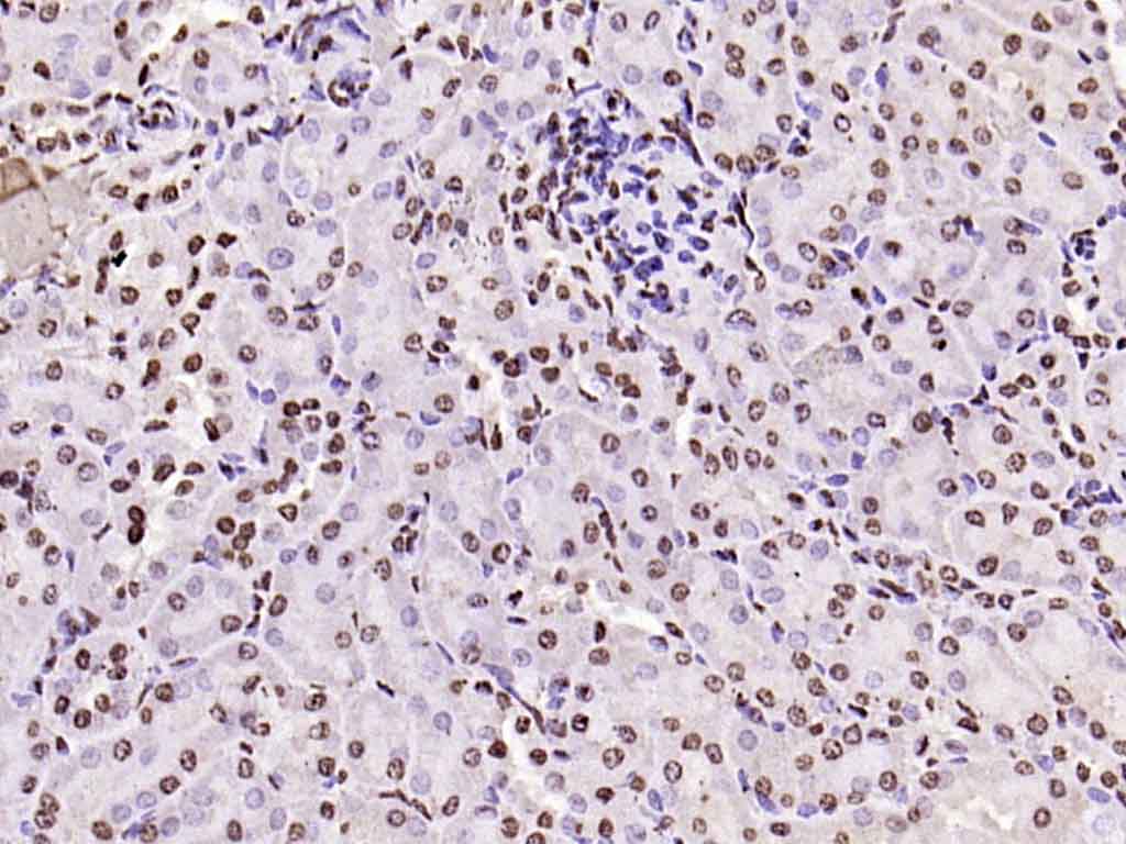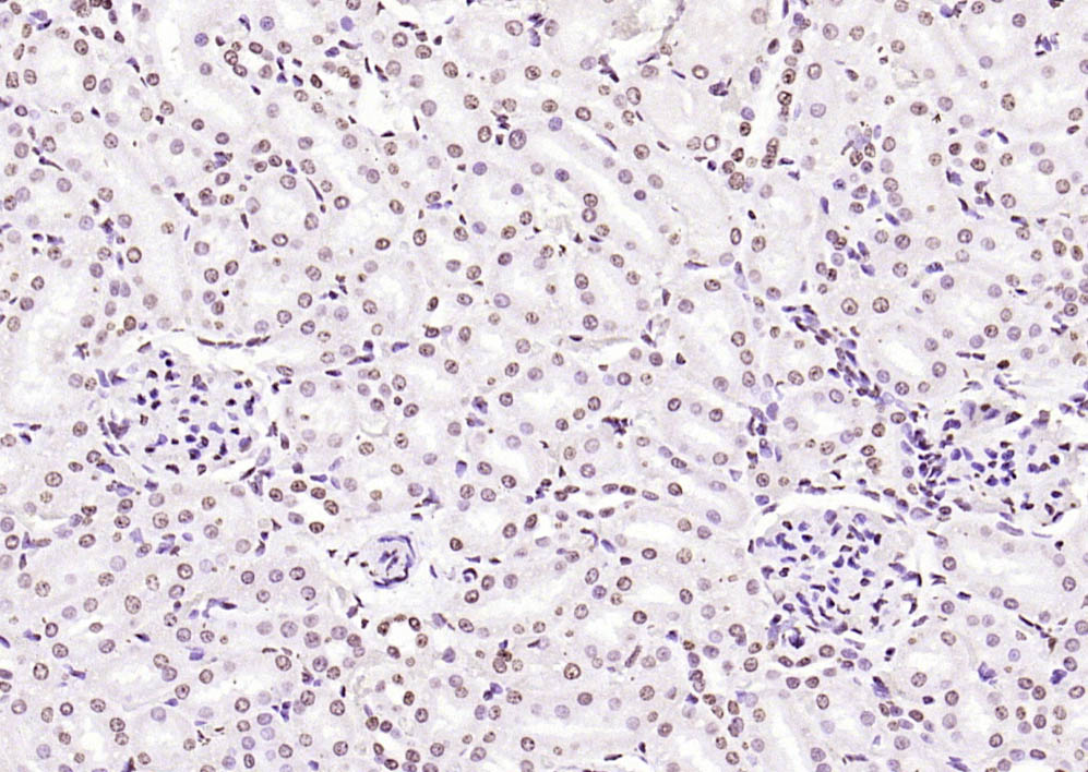 Paraformaldehyde-fixed, paraffin embedded (mouse kidney); Antigen retrieval by boiling in sodium citrate buffer (pH6.0) for 15min; Block endogenous peroxidase by 3% hydrogen peroxide for 20 minutes; Blocking buffer (normal goat serum) at 37°C for 30min; Antibody incubation with (Histone H3(Nuclear Loading Control)) Polyclonal Antibody, Unconjugated (bs-0349R ) at 1:200 overnight at 4°C, followed by operating according to SP Kit(Rabbit) (sp-0023) instructionsand DAB staining.