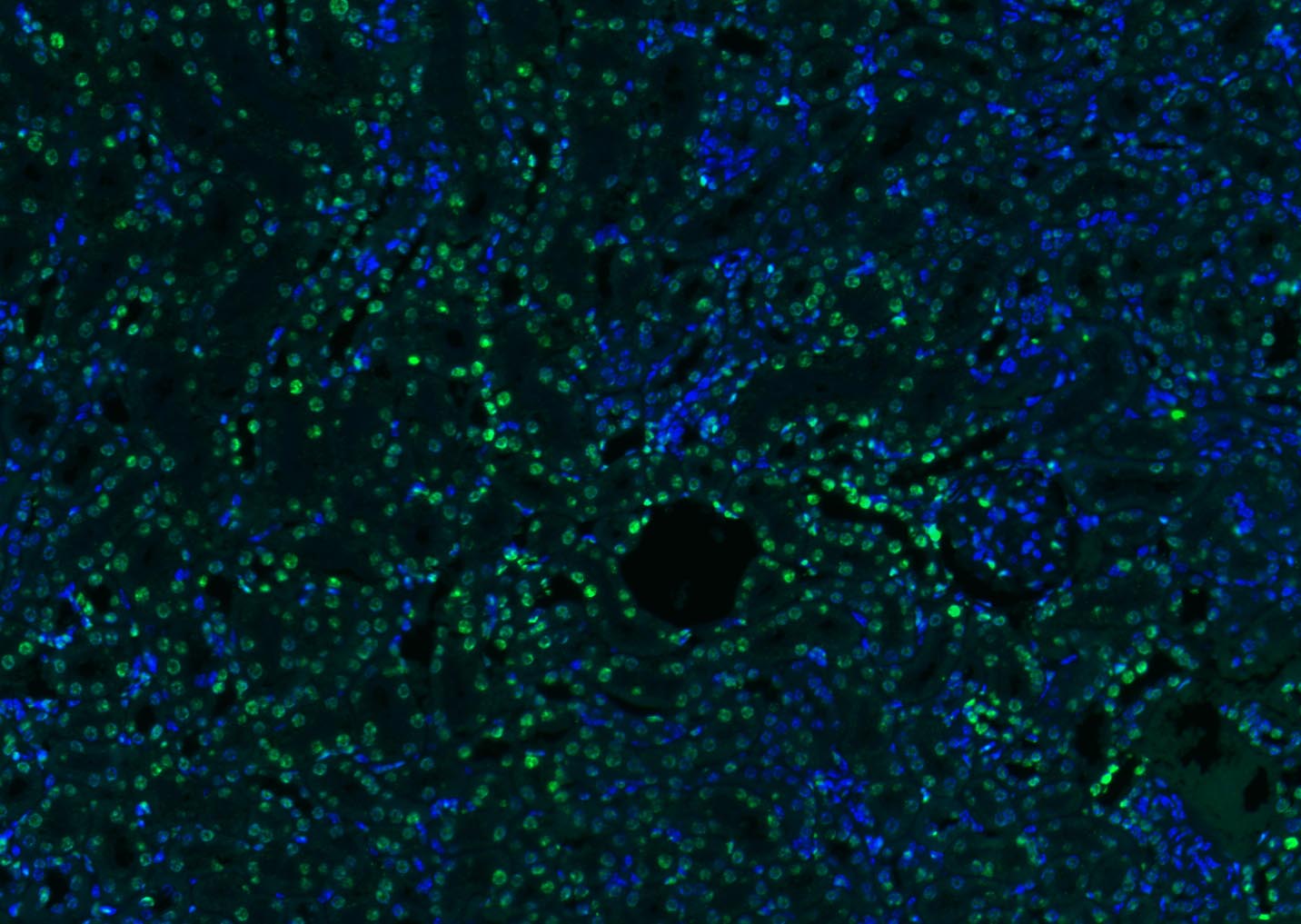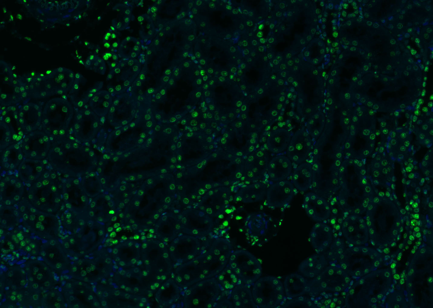 Paraformaldehyde-fixed, paraffin embedded (mouse kidney); Antigen retrieval by boiling in sodium citrate buffer (pH6.0) for 15min; Blocking buffer (normal goat serum) at 37°C for 30min; Antibody incubation with (Histone H3 (Nuclear Loading Control)) Polyclonal Antibody, Unconjugated (bs-0349R) at 1:300 overnight at 4°C, followed by a conjugated Goat Anti-Rabbit IgG antibody (YF488) for 90 minutes, and DAPI for nuclei staining.