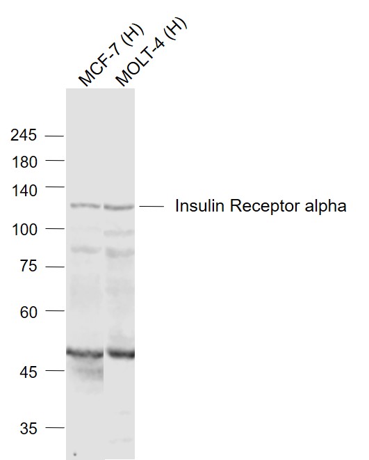Sample: Lane 1: MCF-7 (Human) Cell Lysate at 30 ug Lane 2: MOLT-4 (Human) Cell Lysate at 30 ug Primary: Anti-Insulin Receptor alpha (bs-0047R) at 1/1000 dilution Secondary: IRDye800CW Goat Anti-Rabbit IgG at 1/20000 dilution Predicted band size: 120 kD Observed band size: 120 kD