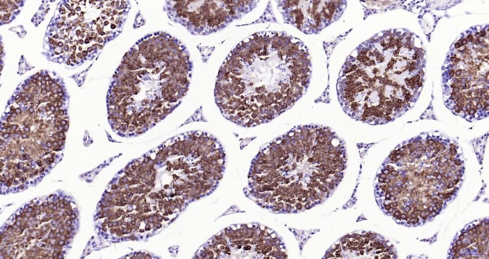 Paraformaldehyde-fixed, paraffin embedded Rat Testicles; Antigen retrieval by boiling in sodium citrate buffer (pH6.0) for 15 min; Antibody incubation with Nrf2 Polyclonal Antibody, Unconjugated (bs-1074R) at 1:200 overnight at 4°C, followed by conjugation to the bs-0295G-HRP and DAB (C-0010) staining.