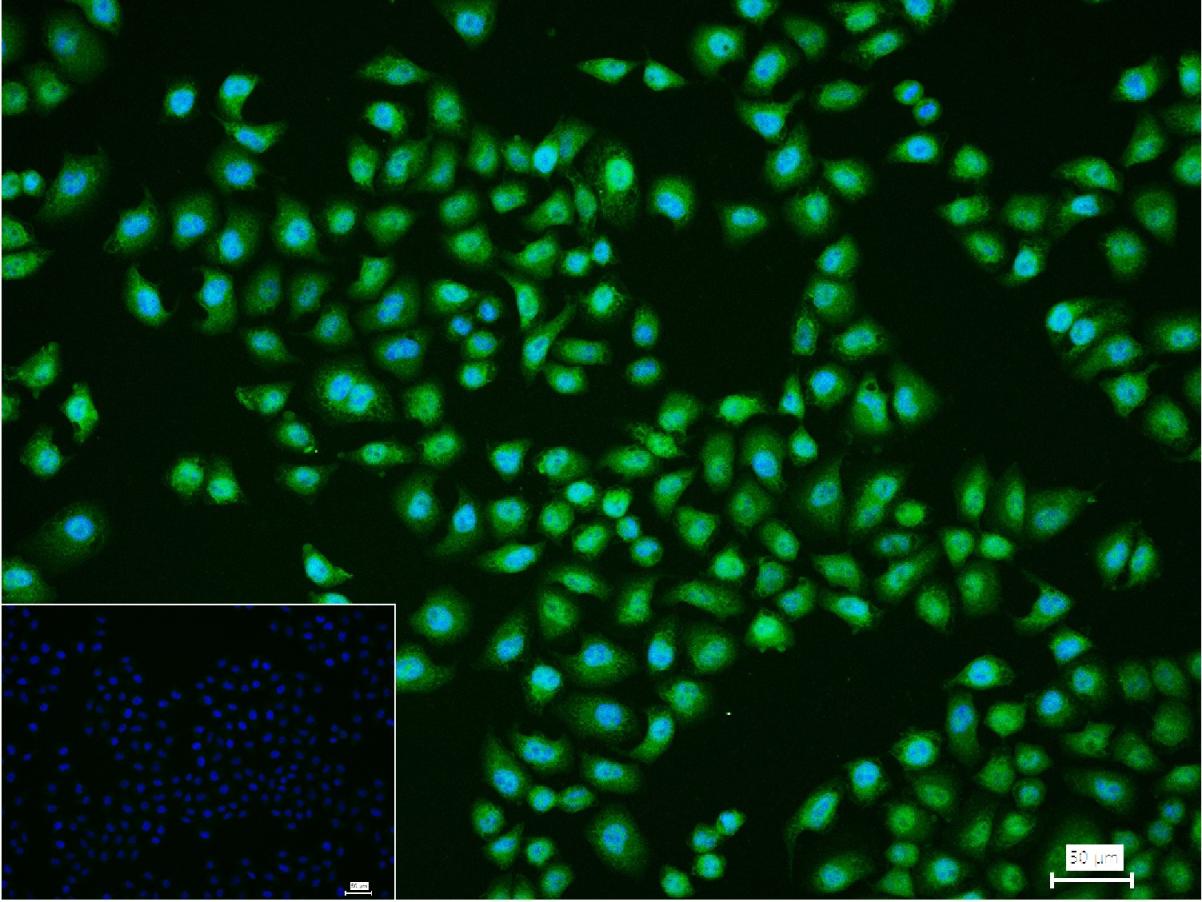 4% Paraformaldehyde-fixed Hela (H) (UV stimulated)cell; Triton X-100 at r.t. for 20 min; Antibody incubation with (P38 MAPK/MAPK14) polyclonal Antibody, unconjugated (bs-0637R) 1:100, 90 min at 37°C; followed by conjugated Goat Anti-Rabbit IgG antibody (green, bs-40295G-FITC) at 37°C for 90 min, DAPI (blue, C02-04002) was used to stain the cell nuclei. PBS instead of the primary antibody was used as the blank control.