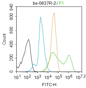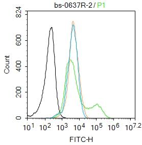 The cells were fixed with 2% paraformaldehyde for 10 min at 37℃. Primary antibody (bs-0637R, 1μg /1x10^6 cells) were incubated for 30 min at room temperature, followed by 1 X PBS containing 0.5% BSA + 1 0% goat serum (15 min) to block non-specific protein-protein interactions. Then the Goat Anti-rabbit IgG/FITC antibody was added into the blocking buffer mentioned above to react with the primary antibody at 1/200 dilution for 40 min at room temperature. Acquisition of 20,000 events was performed.