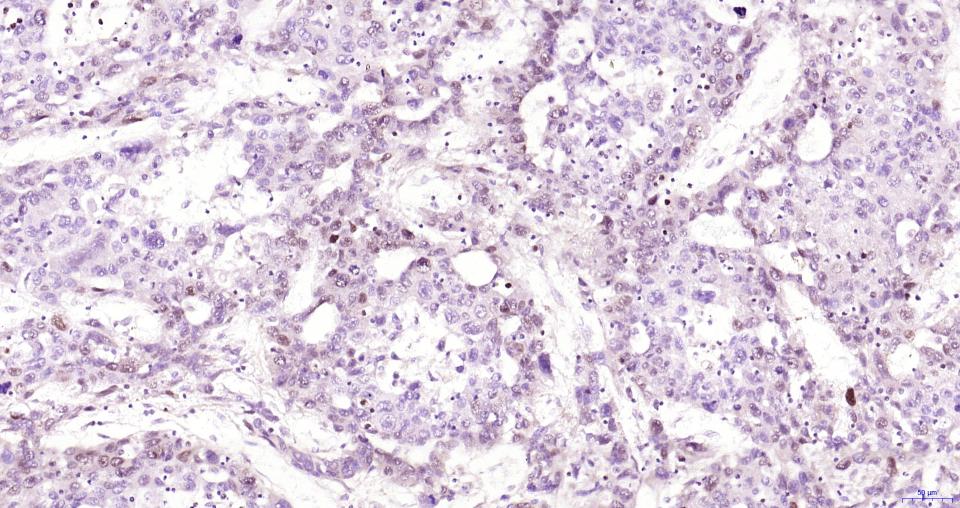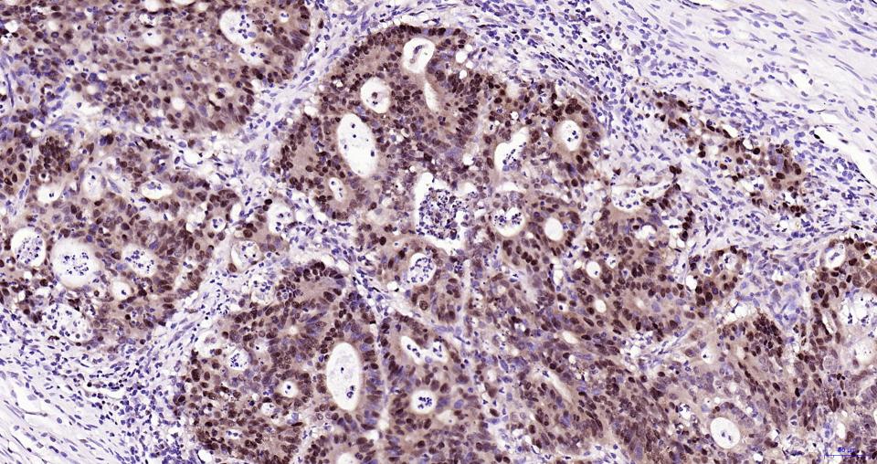 Paraformaldehyde-fixed, paraffin embedded Human Colon Cancer; Antigen retrieval by boiling in sodium citrate buffer (pH6.0) for 15 min; Antibody incubation with PCNA Polyclonal Antibody, Unconjugated (bs-0754R) at 1:800 overnight at 4°C, followed by conjugation to the SP Kit (Rabbit, SP-0023) and DAB (C-0010) staining.