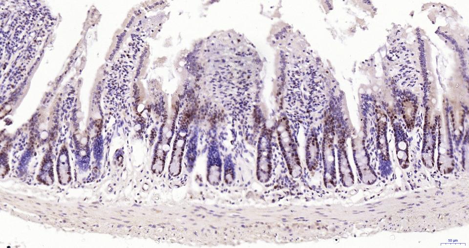 Paraformaldehyde-fixed, paraffin embedded Mouse Small Intestine; Antigen retrieval by boiling in sodium citrate buffer (pH6.0) for 15 min; Antibody incubation with PCNA Polyclonal Antibody, Unconjugated (bs-0754R) at 1:800 overnight at 4°C, followed by conjugation to the SP Kit (Rabbit, SP-0023) and DAB (C-0010) staining.