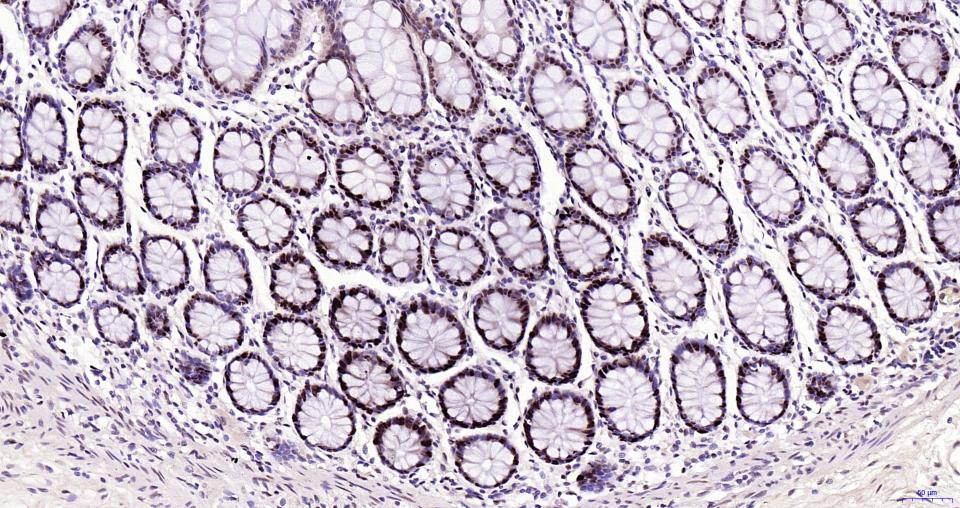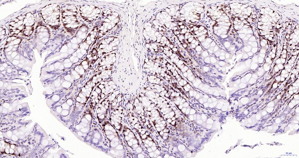 Paraformaldehyde-fixed, paraffin embedded Mouse Colon; Antigen retrieval by boiling in sodium citrate buffer (pH6.0) for 15 min; Antibody incubation with PCNA Polyclonal Antibody, Unconjugated (bs-0754R) at 1:800 overnight at 4°C, followed by conjugation to the SP Kit (Rabbit, SP-0023) and DAB (C-0010) staining.