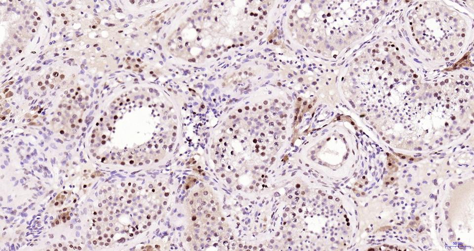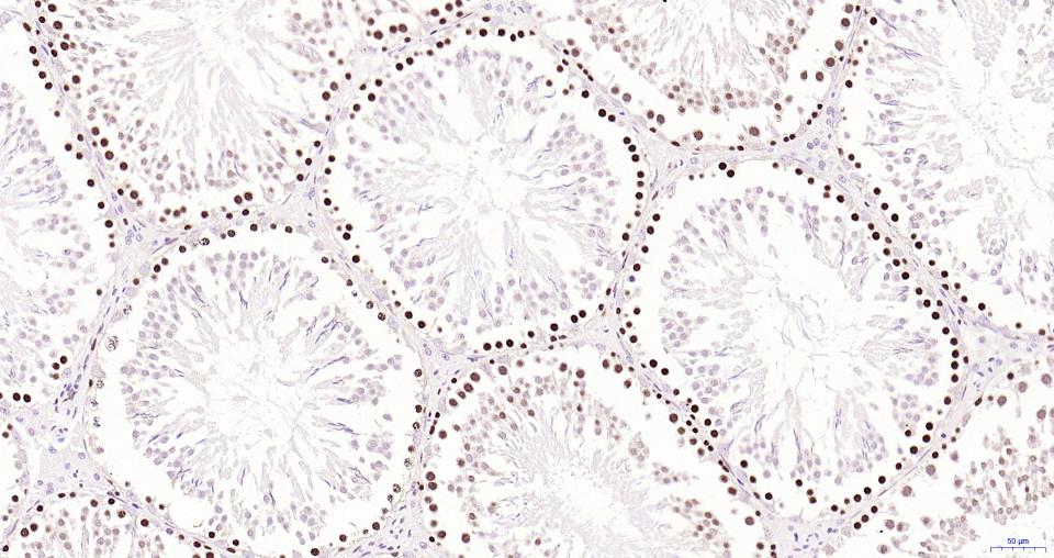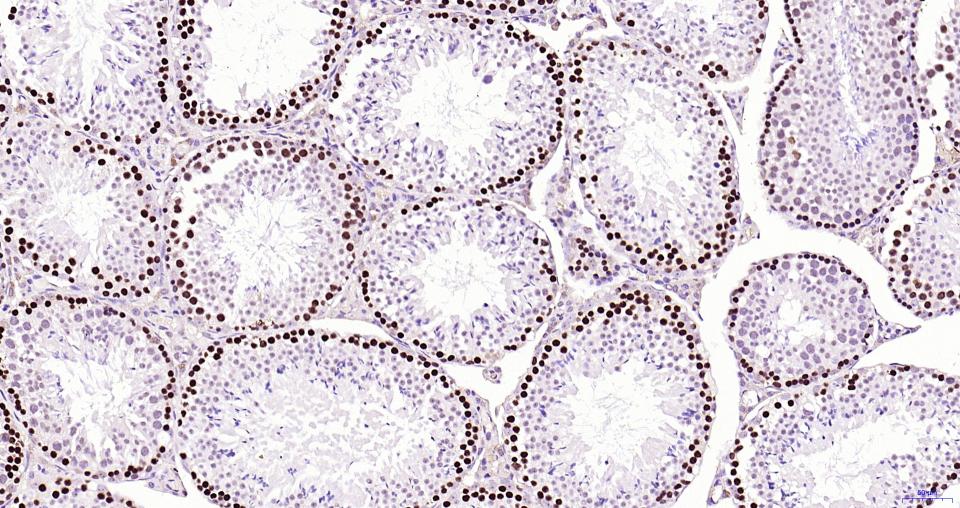 Paraformaldehyde-fixed, paraffin embedded Rat Testicles; Antigen retrieval by boiling in sodium citrate buffer (pH6.0) for 15 min; Antibody incubation with PCNA Polyclonal Antibody, Unconjugated (bs-0754R) at 1:800 overnight at 4°C, followed by conjugation to the SP Kit (Rabbit, SP-0023) and DAB (C-0010) staining.