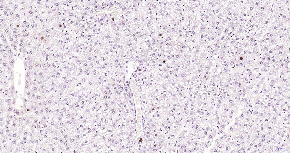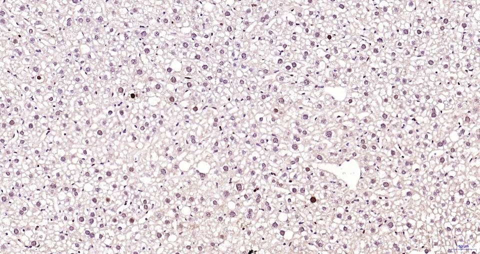 Paraformaldehyde-fixed, paraffin embedded Mouse Liver; Antigen retrieval by boiling in sodium citrate buffer (pH6.0) for 15 min; Antibody incubation with PCNA Polyclonal Antibody, Unconjugated (bs-0754R) at 1:800 overnight at 4°C, followed by conjugation to the SP Kit (Rabbit, SP-0023) and DAB (C-0010) staining.