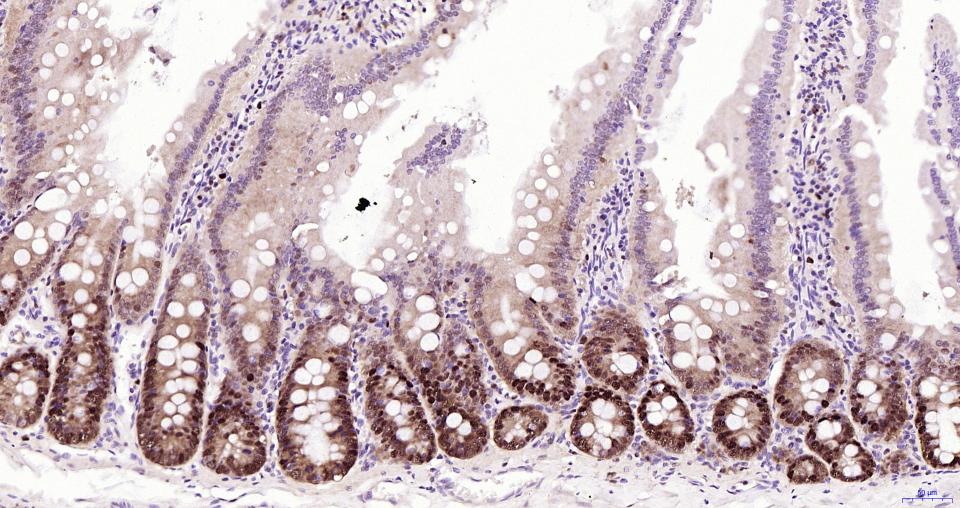 Paraformaldehyde-fixed, paraffin embedded Rat Small Intestine; Antigen retrieval by boiling in sodium citrate buffer (pH6.0) for 15 min; Antibody incubation with PCNA Polyclonal Antibody, Unconjugated (bs-0754R) at 1:800 overnight at 4°C, followed by conjugation to the SP Kit (Rabbit, SP-0023) and DAB (C-0010) staining.
