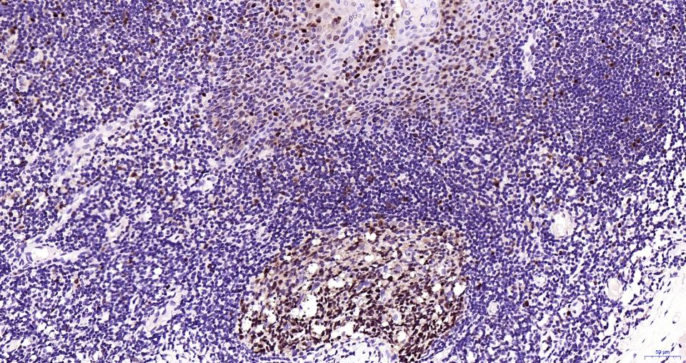 Paraformaldehyde-fixed, paraffin embedded Human Tonsil; Antigen retrieval by boiling in sodium citrate buffer (pH6.0) for 15 min; Antibody incubation with PCNA Polyclonal Antibody, Unconjugated (bs-0754R) at 1:800 overnight at 4°C, followed by conjugation to the SP Kit (Rabbit, SP-0023) and DAB (C-0010) staining.