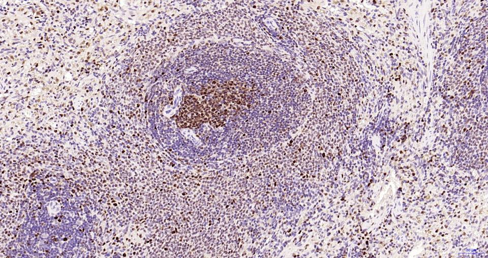 Paraformaldehyde-fixed, paraffin embedded Rat Spleen; Antigen retrieval by boiling in sodium citrate buffer (pH6.0) for 15 min; Antibody incubation with PCNA Polyclonal Antibody, Unconjugated (bs-0754R) at 1:800 overnight at 4°C, followed by conjugation to the SP Kit (Rabbit, SP-0023) and DAB (C-0010) staining.