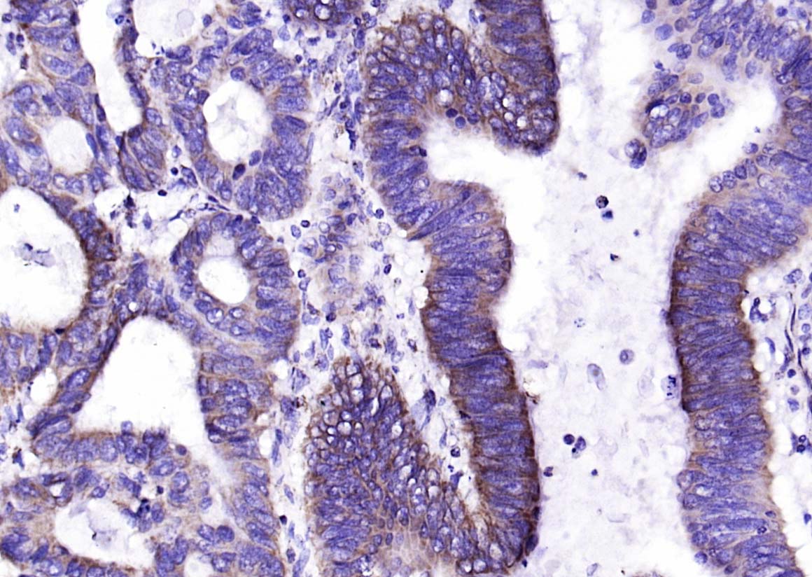 Paraformaldehyde-fixed, paraffin embedded (human colon carcinoma); Antigen retrieval by boiling in sodium citrate buffer (pH6.0) for 15min; Block endogenous peroxidase by 3% hydrogen peroxide for 20 minutes; Blocking buffer (normal goat serum) at 37°C for 30min; Antibody incubation with (galectin 9) Polyclonal Antibody, Unconjugated (bs-0604R) at 1:200 overnight at 4°C, followed by operating according to SP Kit(Rabbit) (sp-0023) instructionsand DAB staining.