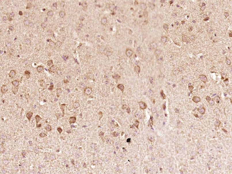 Paraformaldehyde-fixed, paraffin embedded (Mouse brain); Antigen retrieval by boiling in sodium citrate buffer (pH6.0) for 15min; Block endogenous peroxidase by 3% hydrogen peroxide for 20 minutes; Blocking buffer (normal goat serum) at 37°C for 30min; Antibody incubation with (RANTES) Polyclonal Antibody, Unconjugated (bs-1324R) at 1:400 overnight at 4°C, followed by operating according to SP Kit(Rabbit) (sp-0023) instructionsand DAB staining.