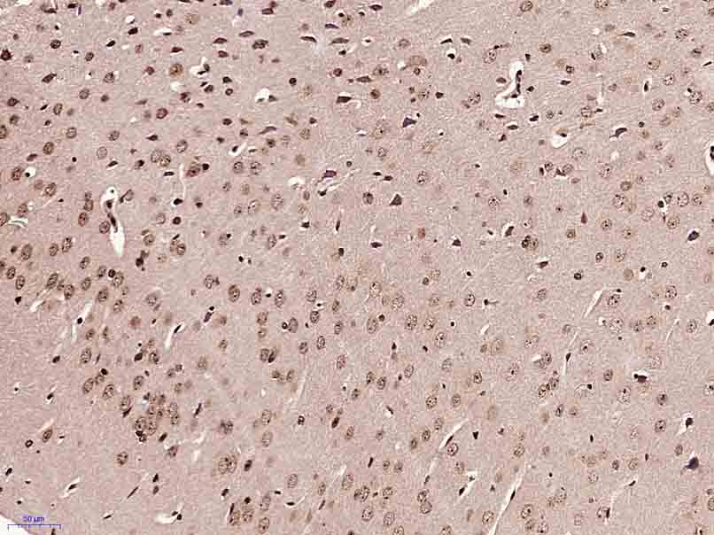Paraformaldehyde-fixed, paraffin embedded (Mouse brain); Antigen retrieval by boiling in sodium citrate buffer (pH6.0) for 15min; Block endogenous peroxidase by 3% hydrogen peroxide for 20 minutes; Blocking buffer (normal goat serum) at 37°C for 30min; Antibody incubation with (HFH4) Polyclonal Antibody, Unconjugated (bs-1775R) at 1:400 overnight at 4°C, followed by operating according to SP Kit(Rabbit) (sp-0023) instructionsand DAB staining.