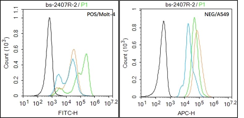 Molt4(Positive)and A549(Negative control)cells (black) were fixed with 4% PFA for 10min at room temperature, permeabilized with PBST for 20 min at room temperature, and incubated in 5% BSA blocking buffer for 30 min at room temperature. Cells were then stained with SV2A Antibody(bs-2407R)at 1:50 dilution in blocking buffer and incubated for 30 min at room temperature, washed twice with 2% BSA in PBS, followed by secondary antibody(blue) incubation for 40 min at room temperature. Acquisitions of 20,000 events were performed. Cells stained with primary antibody (green), and isotype control (orange).