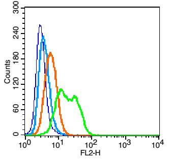 Blank control(blue): U937(fixed with 2% paraformaldehyde (10 min)). Primary Antibody: Rabbit Anti-CD93 antibody(bs-2474R), Dilution: 1μg in 100 μL 1X PBS containing 0.5% BSA; Isotype Control Antibody: Rabbit IgG(orange) ,used under the same conditions ); Secondary Antibody: Goat anti-rabbit IgG-PE(white blue), Dilution: 1:200 in 1 X PBS containing 0.5% BSA.