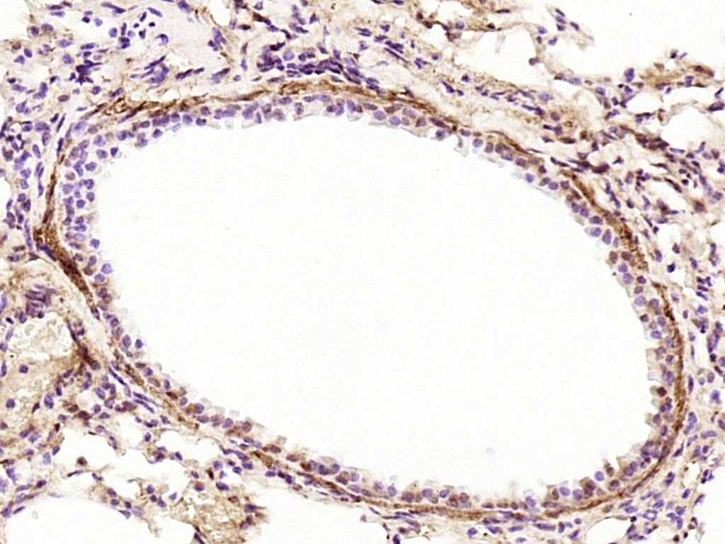 Paraformaldehyde-fixed, paraffin embedded (mouse lung); Antigen retrieval by boiling in sodium citrate buffer (pH6.0) for 15min; Block endogenous peroxidase by 3% hydrogen peroxide for 20 minutes; Blocking buffer (normal goat serum) at 37°C for 30min; Antibody incubation with (phospho-JAK2 (Tyr1007+Tyr1008)) Polyclonal Antibody, Unconjugated (bs-2485R) at 1:2000 overnight at 4°C, followed by operating according to SP Kit(Rabbit) (sp-0023) instructionsand DAB staining.