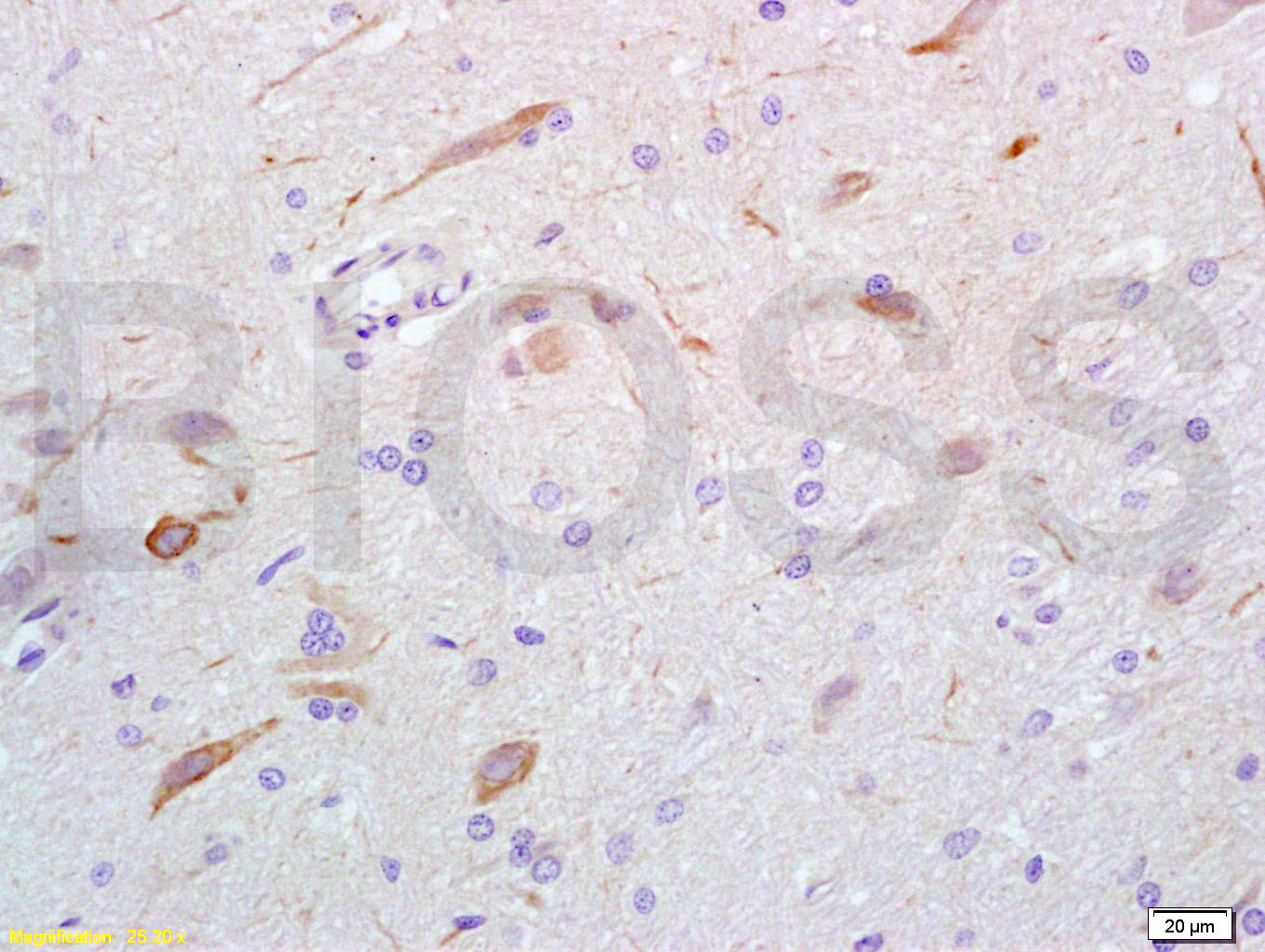 Paraformaldehyde-fixed, paraffin embedded (rat brain); Antigen retrieval by boiling in sodium citrate buffer (pH6.0) for 15min; Block endogenous peroxidase by 3% hydrogen peroxide for 20 minutes; Blocking buffer (normal goat serum) at 37°C for 30min; Antibody incubation with (GABA) Polyclonal Antibody, Unconjugated (bs-2252R) at 1:200 overnight at 4°C, followed by operating according to SP Kit(Rabbit) (sp-0023) instructionsand DAB staining.