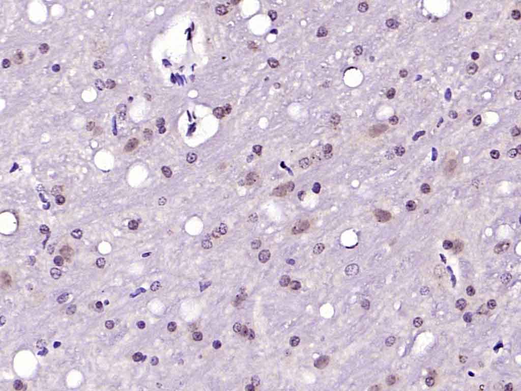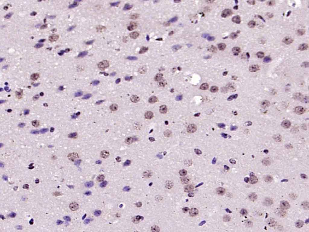 Paraformaldehyde-fixed, paraffin embedded (mouse brain); Antigen retrieval by boiling in sodium citrate buffer (pH6.0) for 15min; Block endogenous peroxidase by 3% hydrogen peroxide for 20 minutes; Blocking buffer (normal goat serum) at 37°C for 30min; Antibody incubation with (phospho-IRS1 (Ser1101)) Polyclonal Antibody, Unconjugated (bs-3197R) at 1:200 overnight at 4°C, followed by operating according to SP Kit(Rabbit) (sp-0023) instructionsand DAB staining.