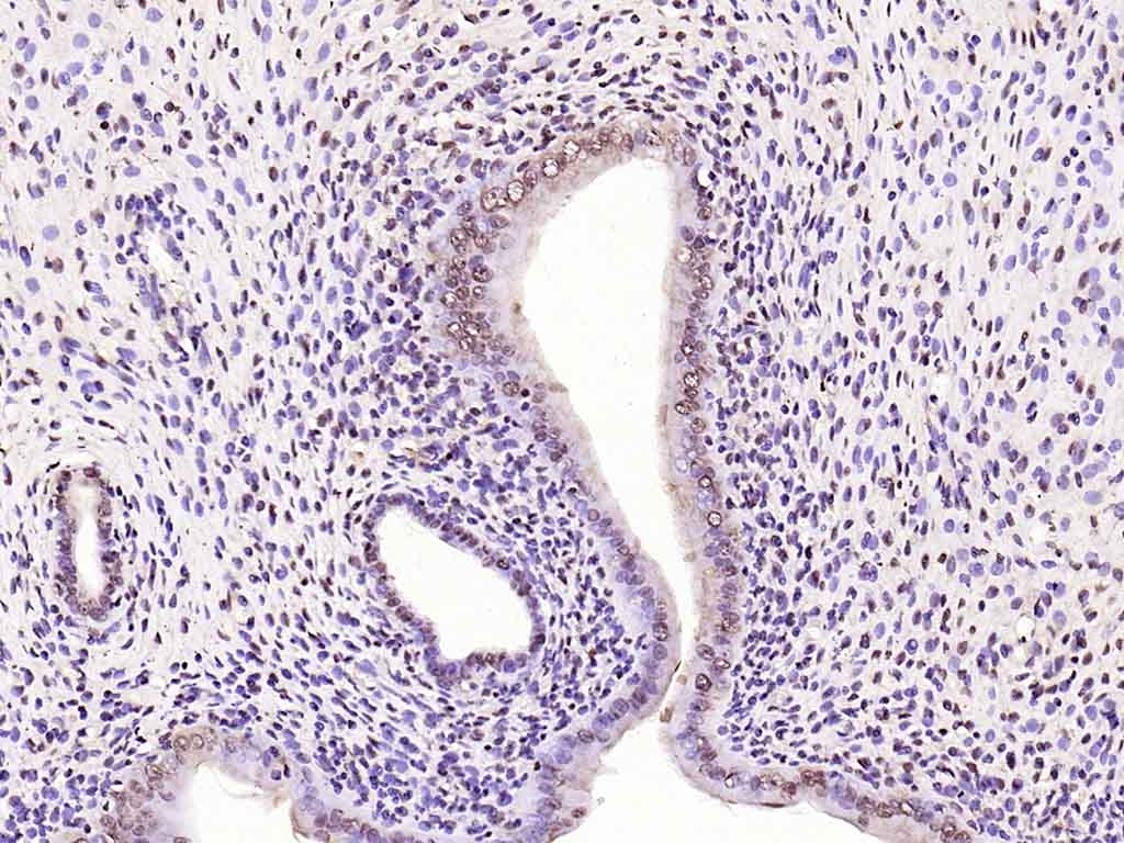 Paraformaldehyde-fixed, paraffin embedded (rat uterus); Antigen retrieval by boiling in sodium citrate buffer (pH6.0) for 15min; Block endogenous peroxidase by 3% hydrogen peroxide for 20 minutes; Blocking buffer (normal goat serum) at 37°C for 30min; Antibody incubation with (phospho-IRS1 (Ser1101)) Polyclonal Antibody, Unconjugated (bs-3197R) at 1:200 overnight at 4°C, followed by operating according to SP Kit(Rabbit) (sp-0023) instructionsand DAB staining.