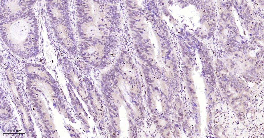 Paraformaldehyde-fixed, paraffin embedded Human Colon Cancer; Antigen retrieval by boiling in sodium citrate buffer (pH6.0) for 15 min; The section was incubated with phospho-P53 (Ser33) Polyclonal Antibody, Unconjugated (bs-3705R) at 1:200 overnight at 4°C, followed by conjugation to the bs-0295G-HRP and DAB (C-0010) staining.