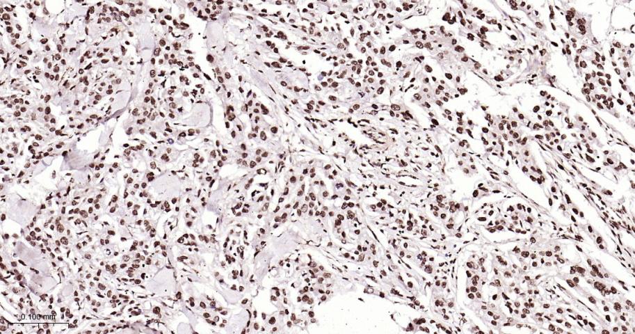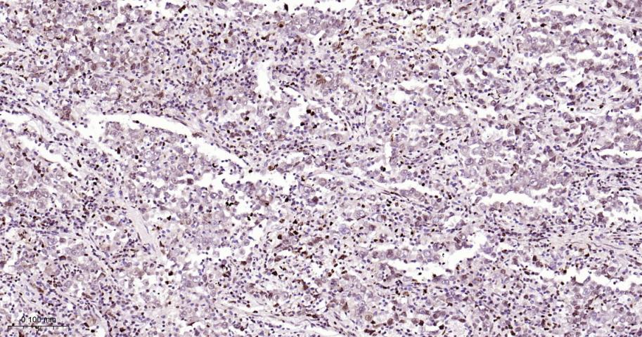 Paraformaldehyde-fixed, paraffin embedded (human gastric carcinoma); Antigen retrieval by boiling in sodium citrate buffer (pH6.0) for 15min; Block endogenous peroxidase by 3% hydrogen peroxide for 20 minutes; Blocking buffer (normal goat serum) at 37°C for 30min; Antibody incubation with (phospho-P53 (Ser33)) Polyclonal Antibody, Unconjugated (bs-3705R ) at 1:200 overnight at 4°C, followed by operating according to SP Kit(Rabbit) (sp-0023) instructionsand DAB staining.