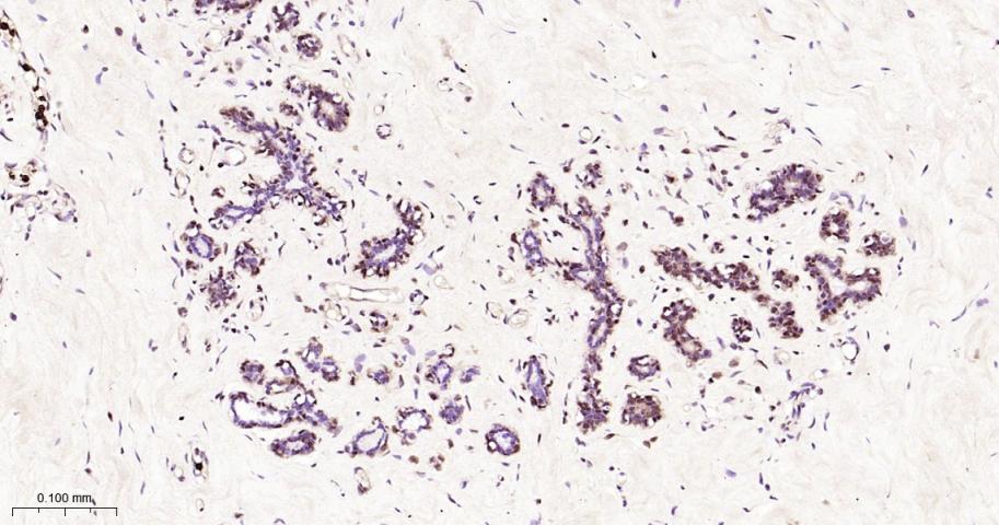 Paraformaldehyde-fixed, paraffin embedded Human Breast; Antigen retrieval by boiling in sodium citrate buffer (pH6.0) for 15 min; The section was incubated with phospho-P53 (Ser33) Polyclonal Antibody, Unconjugated (bs-3705R) at 1:200 overnight at 4°C, followed by conjugation to the bs-0295G-HRP and DAB (C-0010) staining.