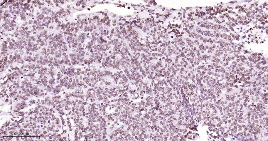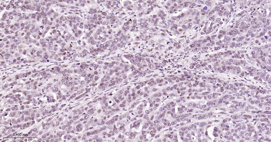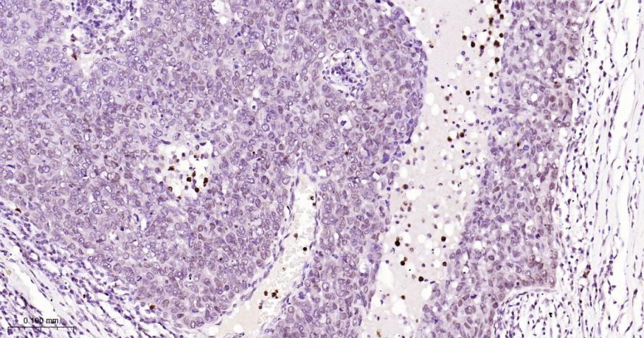 Paraformaldehyde-fixed, paraffin embedded Human Ovarian Cancer; Antigen retrieval by boiling in sodium citrate buffer (pH6.0) for 15 min; The section was incubated with phospho-P53 (Ser33) Polyclonal Antibody, Unconjugated (bs-3705R) at 1:200 overnight at 4°C, followed by conjugation to the bs-0295G-HRP and DAB (C-0010) staining.