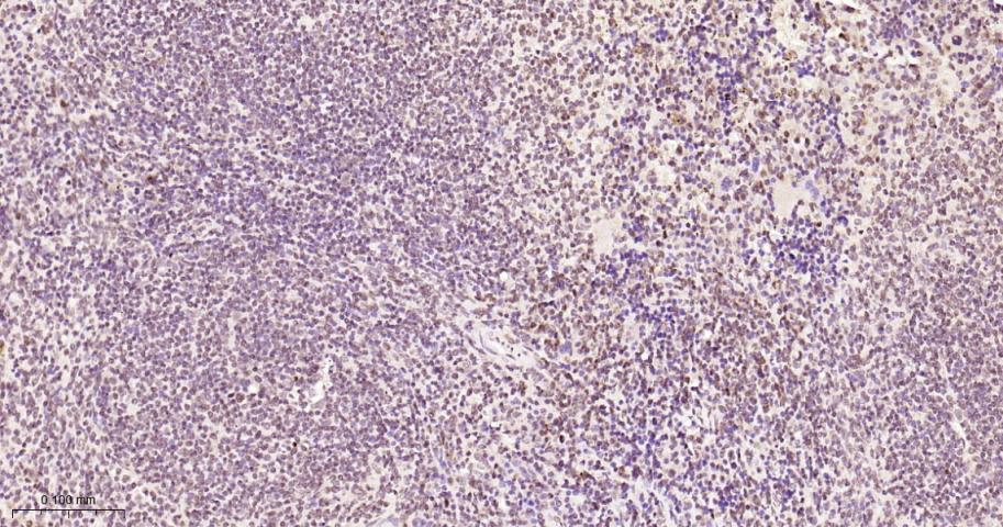 Paraformaldehyde-fixed, paraffin embedded Rat Spleen; Antigen retrieval by boiling in sodium citrate buffer (pH6.0) for 15 min; The section was incubated with phospho-P53 (Ser33) Polyclonal Antibody, Unconjugated (bs-3705R) at 1:200 overnight at 4°C, followed by conjugation to the bs-0295G-HRP and DAB (C-0010) staining.