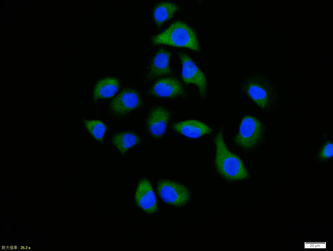 Hela cell; 4% Paraformaldehyde-fixed; Triton X-100 at room temperature for 20 min; Blocking buffer (normal goat serum, C-0005) at 37°C for 20 min; Antibody incubation with (phospho-IRS-2(Ser731)) polyclonal Antibody, Unconjugated (bs-5397R) 1:100, 90 minutes at 37°C; followed by a conjugated Goat Anti-Rabbit IgG antibody at 37°C for 90 minutes, DAPI (blue, C02-04002) was used to stain the cell nuclei.