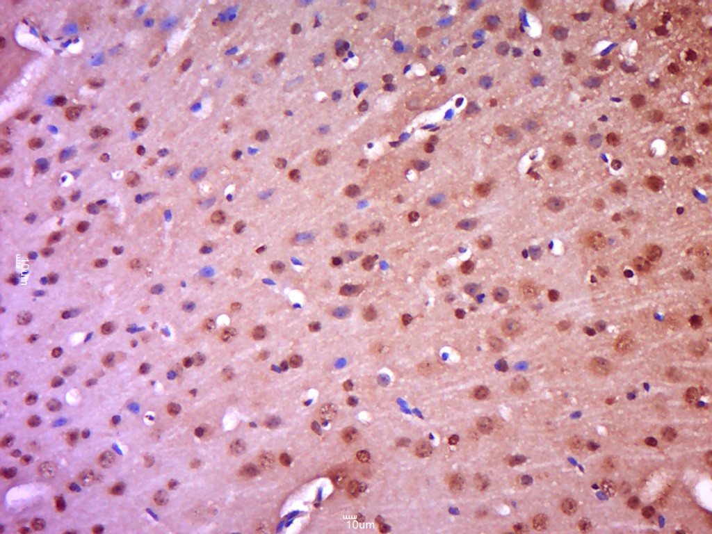 Paraformaldehyde-fixed, paraffin embedded (mouse brain); Antigen retrieval by boiling in sodium citrate buffer (pH6.0) for 15min; Block endogenous peroxidase by 3% hydrogen peroxide for 20 minutes; Blocking buffer (normal goat serum) at 37°C for 30min; Antibody incubation with (phospho-IKB alpha (Tyr305) ) Polyclonal Antibody, Unconjugated (bs-5515R) at 1:400 overnight at 4°C, followed by a conjugated secondary antibody (sp-0023) for 20 minutes and DAB staining.