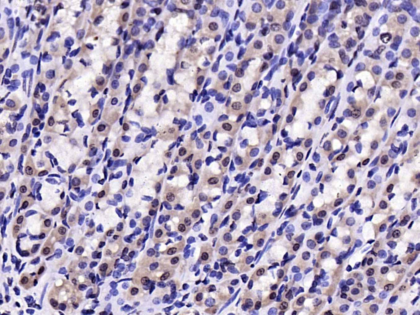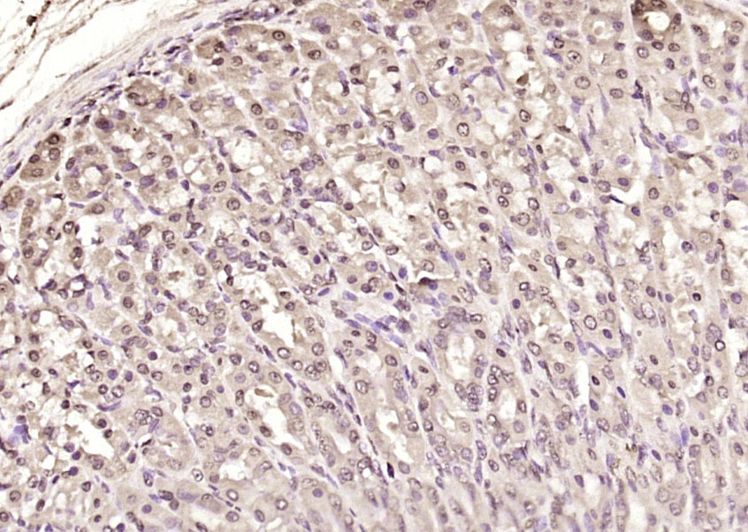 Paraformaldehyde-fixed, paraffin embedded (rat stomach); Antigen retrieval by boiling in sodium citrate buffer (pH6.0) for 15min; Block endogenous peroxidase by 3% hydrogen peroxide for 20 minutes; Blocking buffer (normal goat serum) at 37°C for 30min; Antibody incubation with (phospho-IKB alpha (Tyr305)) Polyclonal Antibody, Unconjugated (bs-5515R) at 1:200 overnight at 4°C, followed by operating according to SP Kit(Rabbit) (sp-0023) instructionsand DAB staining.