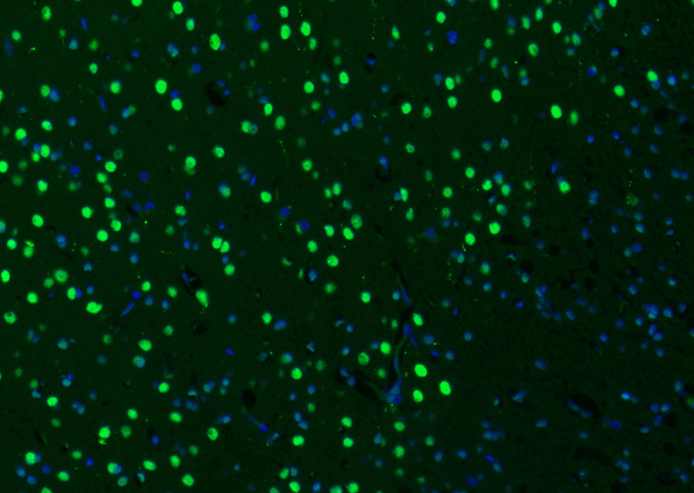 Paraformaldehyde-fixed, paraffin embedded (mouse brain tissue); Antigen retrieval by boiling in sodium citrate buffer (pH6.0) for 15min; Blocking buffer (normal goat serum) at 37°C for 30min; Antibody incubation with (B MyB) Polyclonal Antibody, Unconjugated (bs-5960R) at 1:200 overnight at 4°C, followed by a conjugated Goat Anti-Rabbit IgG antibody (bs-0295G-AF488) for 90 minutes, and DAPI for nuclei staining.