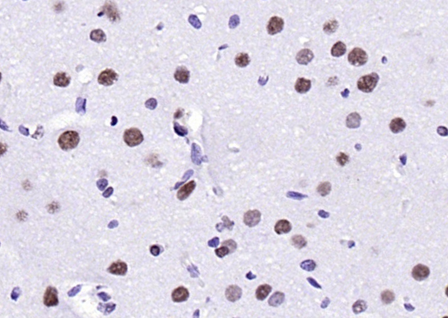 Paraformaldehyde-fixed, paraffin embedded (mouse brain); Antigen retrieval by boiling in sodium citrate buffer (pH6.0) for 15min; Block endogenous peroxidase by 3% hydrogen peroxide for 20 minutes; Blocking buffer (normal goat serum) at 37°C for 30min; Antibody incubation with (MyB) Polyclonal Antibody, Unconjugated (bs-5960R) at 1:200 overnight at 4°C, followed by operating according to SP Kit(Rabbit) (sp-0023) instructionsand DAB staining.