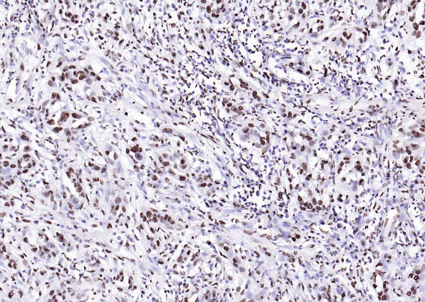 Paraformaldehyde-fixed, paraffin embedded (human gastric carcinoma); Antigen retrieval by boiling in sodium citrate buffer (pH6.0) for 15min; Block endogenous peroxidase by 3% hydrogen peroxide for 20 minutes; Blocking buffer (normal goat serum) at 37°C for 30min; Antibody incubation with (MYBL2) Polyclonal Antibody, Unconjugated (bs-5960R) at 1:200 overnight at 4°C, followed by operating according to SP Kit(Rabbit) (sp-0023) instructionsand DAB staining.