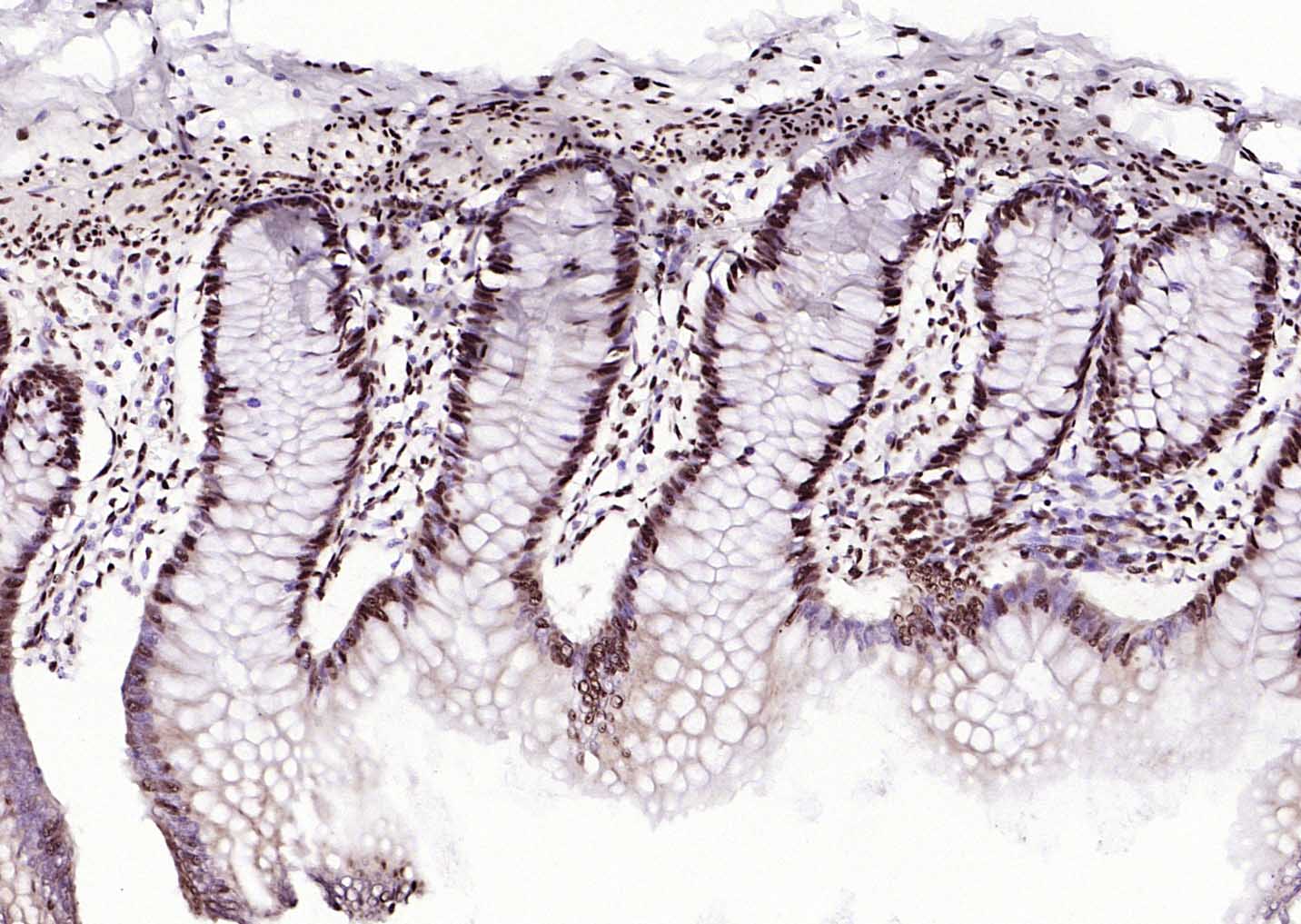 Paraformaldehyde-fixed, paraffin embedded (human colon); Antigen retrieval by boiling in sodium citrate buffer (pH6.0) for 15min; Block endogenous peroxidase by 3% hydrogen peroxide for 20 minutes; Blocking buffer (normal goat serum) at 37°C for 30min; Antibody incubation with (MYBL2) Polyclonal Antibody, Unconjugated (bs-5960R) at 1:200 overnight at 4°C, followed by operating according to SP Kit(Rabbit) (sp-0023) instructionsand DAB staining.