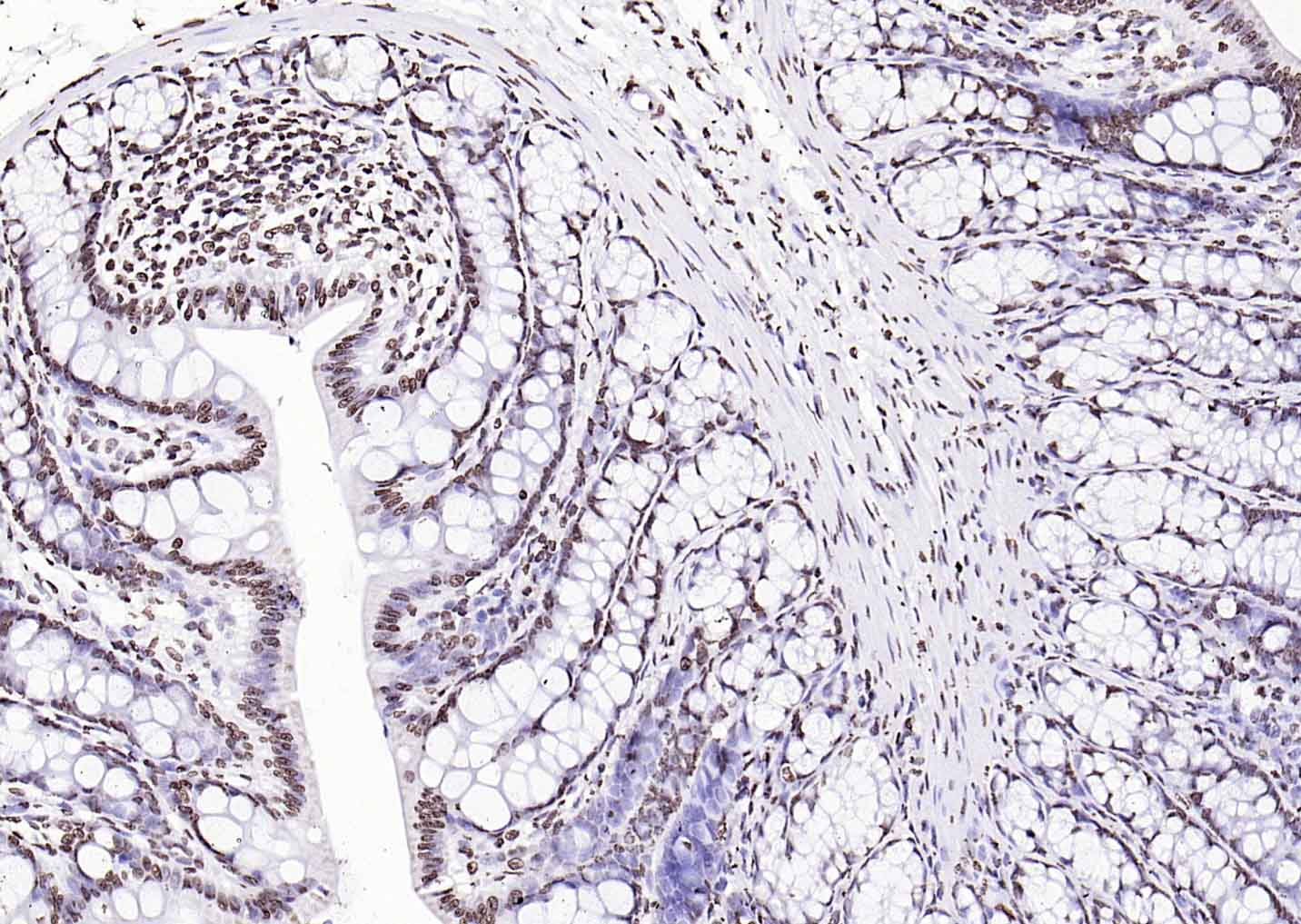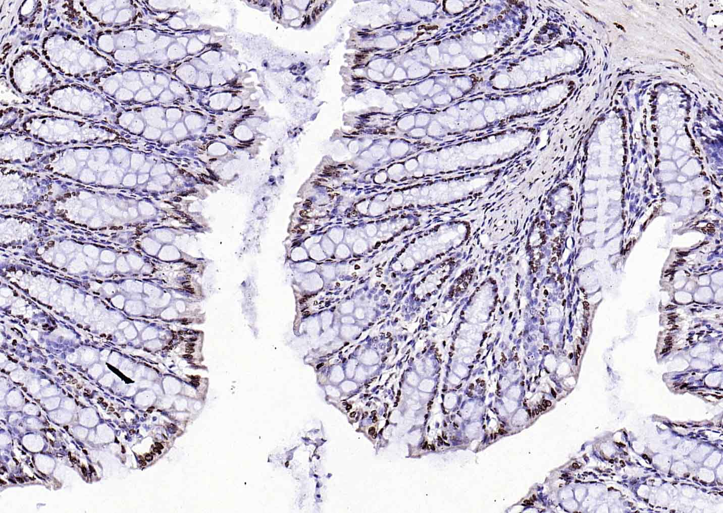 Paraformaldehyde-fixed, paraffin embedded (rat colon); Antigen retrieval by boiling in sodium citrate buffer (pH6.0) for 15min; Block endogenous peroxidase by 3% hydrogen peroxide for 20 minutes; Blocking buffer (normal goat serum) at 37°C for 30min; Antibody incubation with (Histone H3 (Nuclear Loading Control)) Polyclonal Antibody, Unconjugated (bs-0349R) at 1:200 overnight at 4°C, followed by operating according to SP Kit(Rabbit) (sp-0023 bs-0295G-HRP 1:100) instructionsand DAB staining.