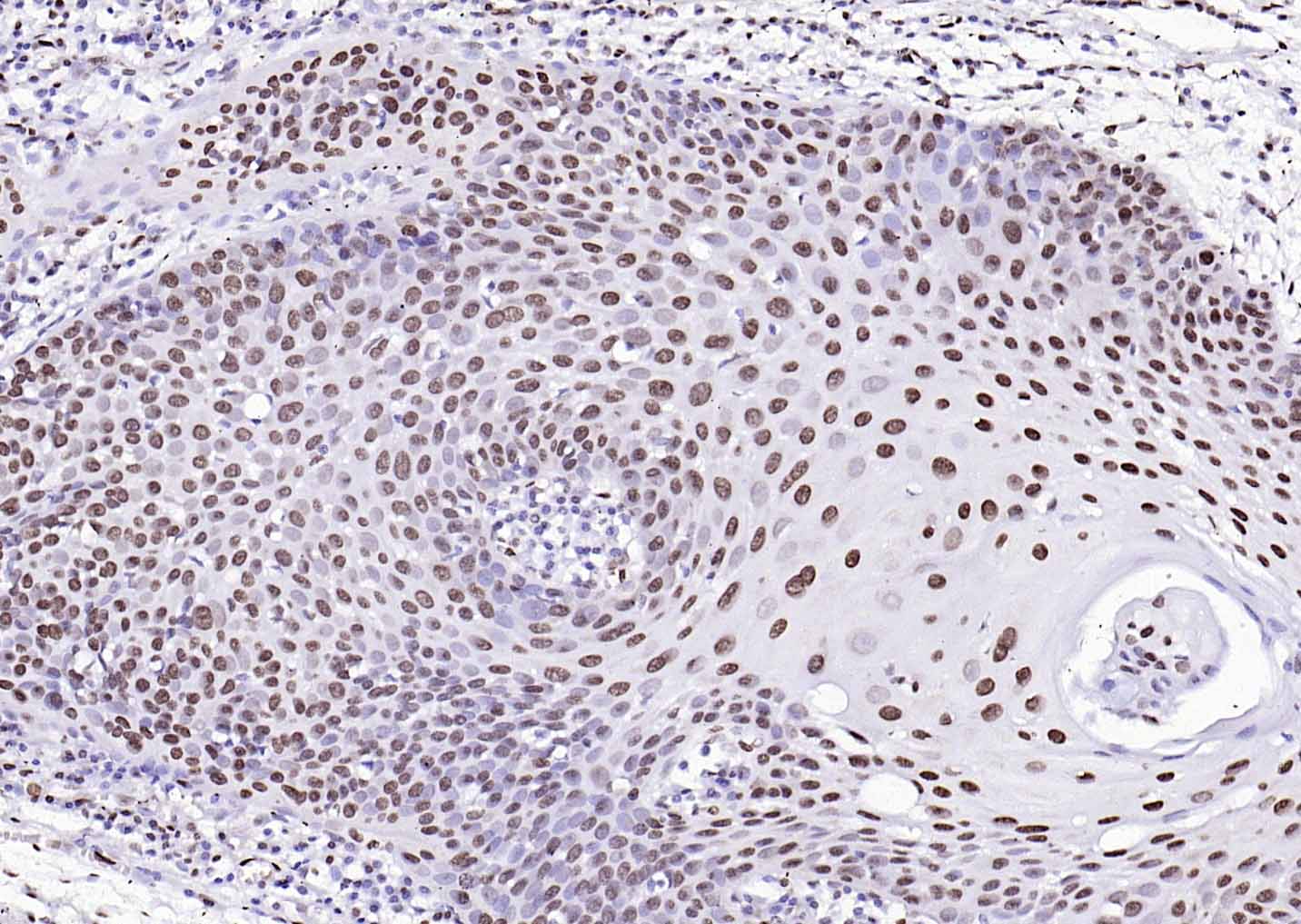 Paraformaldehyde-fixed, paraffin embedded (human laryngeal carcinoma); Antigen retrieval by boiling in sodium citrate buffer (pH6.0) for 15min; Block endogenous peroxidase by 3% hydrogen peroxide for 20 minutes; Blocking buffer (normal goat serum) at 37°C for 30min; Antibody incubation with (Histone H3 (Nuclear Loading Control)) Polyclonal Antibody, Unconjugated (bs-0349R) at 1:200 overnight at 4°C, followed by operating according to SP Kit(Rabbit) (sp-0023 bs-0295G-HRP 1:100) instructionsand DAB staining.
