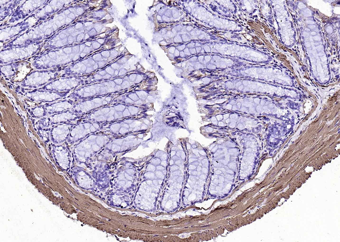 Paraformaldehyde-fixed, paraffin embedded (mouse colon); Antigen retrieval by boiling in sodium citrate buffer (pH6.0) for 15min; Block endogenous peroxidase by 3% hydrogen peroxide for 20 minutes; Blocking buffer (normal goat serum) at 37°C for 30min; Antibody incubation with (alpha smooth muscle Actin) Monoclonal Antibody, Unconjugated (bsm-33187M) at 1:200 overnight at 4°C, followed by operating according to SP Kit(Mouse)(sp-0024 bs-0296G-HRP 1:300) instructionsand DAB staining.
