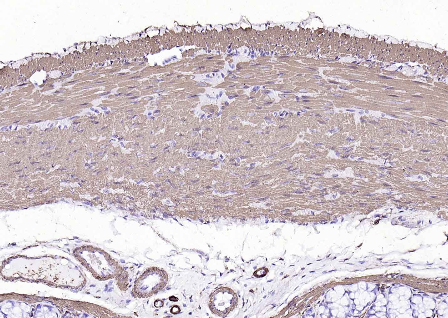Paraformaldehyde-fixed, paraffin embedded (rat stomach); Antigen retrieval by boiling in sodium citrate buffer (pH6.0) for 15min; Block endogenous peroxidase by 3% hydrogen peroxide for 20 minutes; Blocking buffer (normal goat serum) at 37°C for 30min; Antibody incubation with (alpha smooth muscle Actin) Monoclonal Antibody, Unconjugated (bsm-33187M) at 1:200 overnight at 4°C, followed by operating according to SP Kit(Mouse)(sp-0024 bs-0296G-HRP 1:200) instructionsand DAB staining.